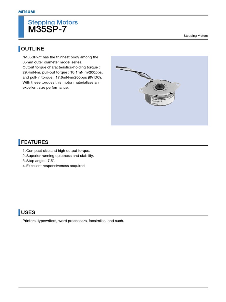 Mitsumispecificationsstepping motorscharacteristicsm35sp 9 50ω 24v dc pull outtorque04 90 datasheet search datasheets datasheet search site for electronic components and semiconductors integrated circuits diodes and other semiconductors. M35sp 9nk stepping motors ø35 2015 09 07. Mitsumi alldatasheet datasheet datasheet search site for electronic components and semiconductors integrated circuits diodes triacs and other semiconductors. Mitsumi mitsumi stepping motors m35sp 11nk multifunction machines scanners etc.